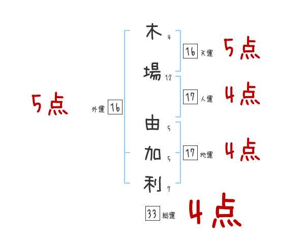外運![]() | 木場由加利さんの外運は16画の5つ星!人望が厚く大きく発展する。逆転成功が見える。 生活面を象徴する運勢です。外部から受ける影響力を表し、結婚運、家庭運や職場、環境への順応性を表します。 |