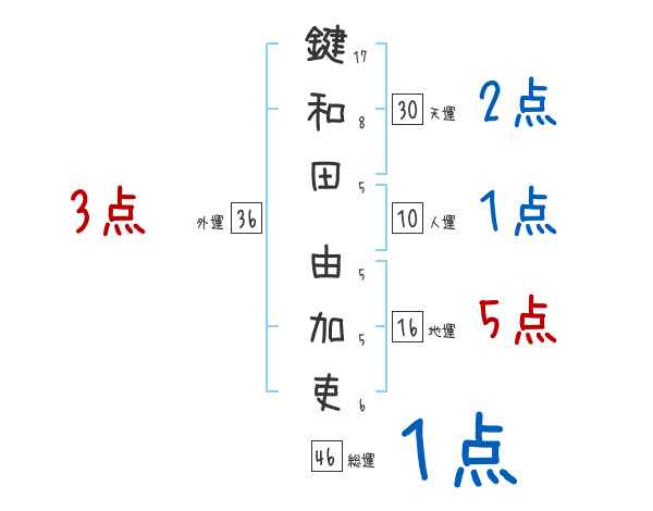天運![]() | 鍵和田由加吏さんの天運は30画の2つ星!浮き沈みの激しさに注意しましょう。 家系が持つ宿命的な運勢を表します。祖先から受け継いだ苗字ですので自分の力が及びません。家柄を象徴します。 |