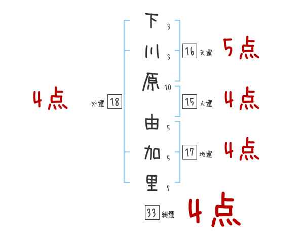 総運![]() | 下川原由加里さんの総運は33画の4つ星!権力志向でプライドが高い。勇気があり運を切り開き成功する。 あなたの人生を表す1番重要な運勢です。生涯を通じて影響する総合運となり、主に50歳以降の晩年期に影響を及ぼします。 |
