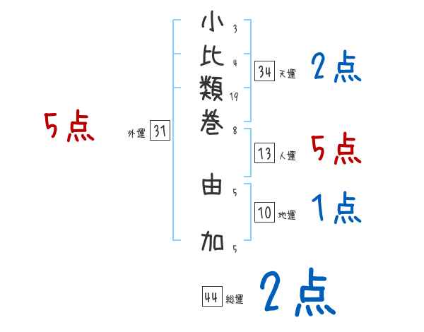 人運![]() | 小比類巻由加さんの人運は13画の5つ星!才能に恵まれ人気がある。名声を手に入れる。円満な人生。 性格や才能などを表す2番目に重要な運勢です。人間関係や協調性、社会的な成功に影響します。主に20歳から50歳ぐらいまでの中年期の運勢を表します。 |