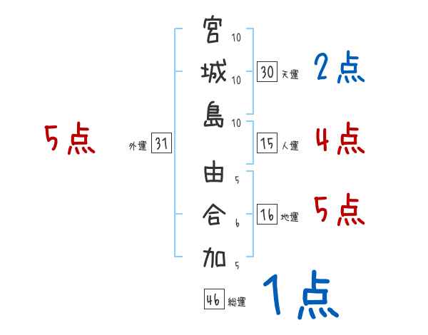 天運![]() | 宮城島由合加さんの天運は30画の2つ星!浮き沈みの激しさに注意しましょう。 家系が持つ宿命的な運勢を表します。祖先から受け継いだ苗字ですので自分の力が及びません。家柄を象徴します。 |