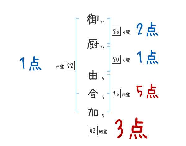 総運![]() | 御厨由合加さんの総運は42画の3つ星!病気に注意。多芸であるが消極的でおとなしい。 あなたの人生を表す1番重要な運勢です。生涯を通じて影響する総合運となり、主に50歳以降の晩年期に影響を及ぼします。 |