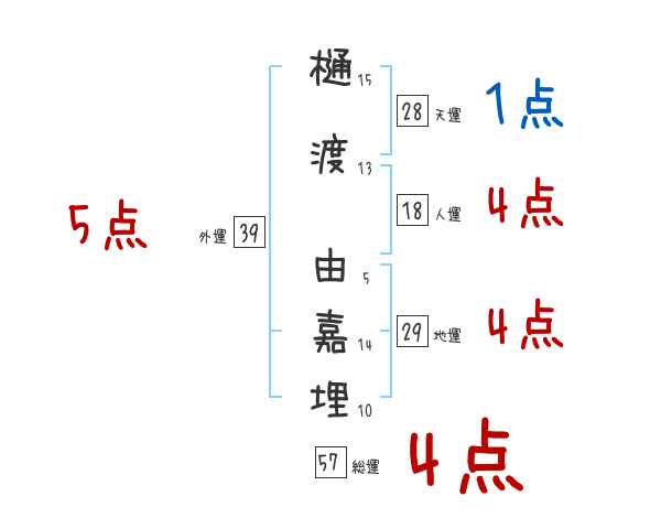 外運![]() | 樋渡由嘉埋さんの外運は39画の5つ星!社交性に優れ人望が厚い。人の上に立ち成功する。 生活面を象徴する運勢です。外部から受ける影響力を表し、結婚運、家庭運や職場、環境への順応性を表します。 |