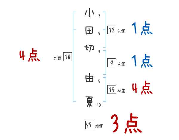 外運![]() | 小田切由夏さんの外運は18画の4つ星!情熱的で剛気。忍耐力があり信頼される。 生活面を象徴する運勢です。外部から受ける影響力を表し、結婚運、家庭運や職場、環境への順応性を表します。 |