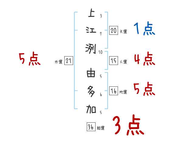 総運![]() | 上江洌由多加さんの総運は36画の3つ星!先見性が豊かです。多少神経質で苦労することも。 あなたの人生を表す1番重要な運勢です。生涯を通じて影響する総合運となり、主に50歳以降の晩年期に影響を及ぼします。 |