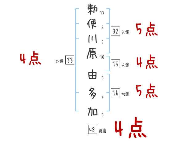 天運![]() | 勅使川原由多加さんの天運は32画の5つ星!柔軟性があり成功する。チャンスが多く金運が良い。 家系が持つ宿命的な運勢を表します。祖先から受け継いだ苗字ですので自分の力が及びません。家柄を象徴します。 |