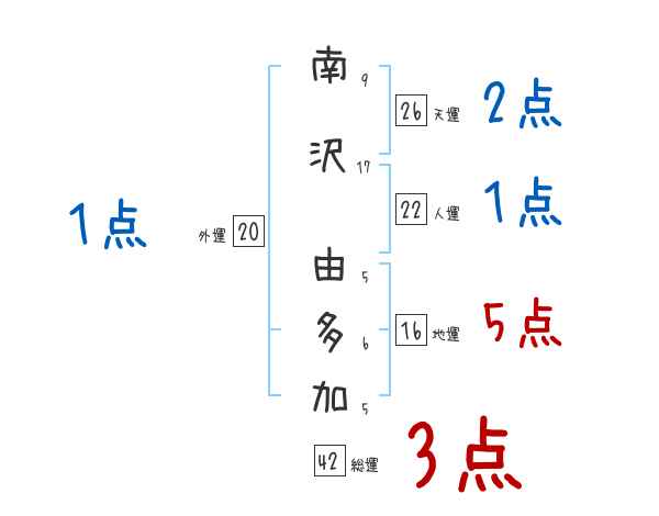 地運![]() | 南沢由多加さんの地運は16画の5つ星!人望が厚く大きく発展する。逆転成功が見える。 個性を表す基礎的な運勢です。性格形成や対人関係、行動力など家庭環境に影響されます。主に誕生してから20歳くらいまでの若年期の運勢を表します。 |