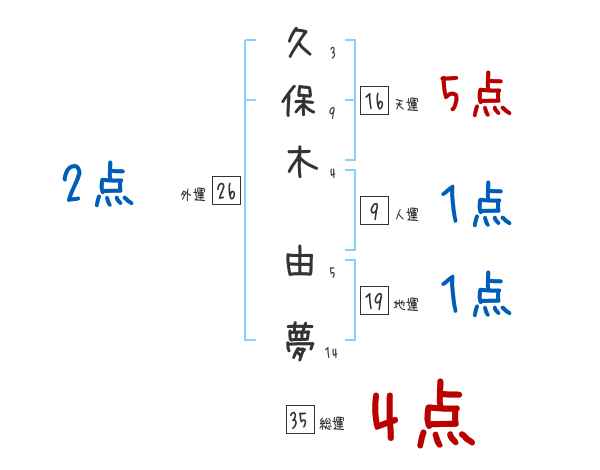 外運![]() | 久保木由夢さんの外運は26画の2つ星!波瀾万丈かも。信頼できる人を大事にしましょう。 生活面を象徴する運勢です。外部から受ける影響力を表し、結婚運、家庭運や職場、環境への順応性を表します。 |
