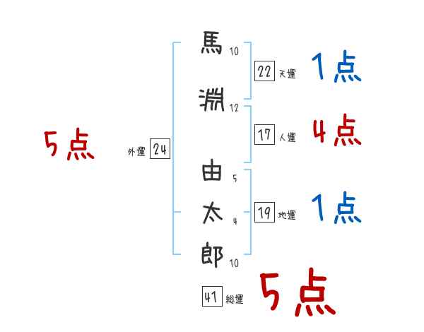 外運![]() | 馬淵由太郎さんの外運は24画の5つ星!家庭運が良く順調な人生。金運にも恵まれる。 生活面を象徴する運勢です。外部から受ける影響力を表し、結婚運、家庭運や職場、環境への順応性を表します。 |