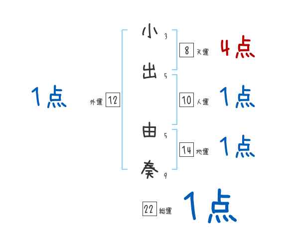 総運![]() | 小出由奏さんの総運は22画の1つ星!努力することが苦手ないっぽう手先が器用。芸術性にも優れる。 あなたの人生を表す1番重要な運勢です。生涯を通じて影響する総合運となり、主に50歳以降の晩年期に影響を及ぼします。 |