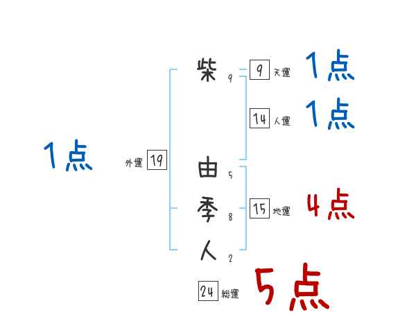 天運![]() | 柴由季人さんの天運は9画の1つ星!消極的で才能を発揮することが苦手なことも。周りの意見に耳を傾けましょう。 家系が持つ宿命的な運勢を表します。祖先から受け継いだ苗字ですので自分の力が及びません。家柄を象徴します。 |