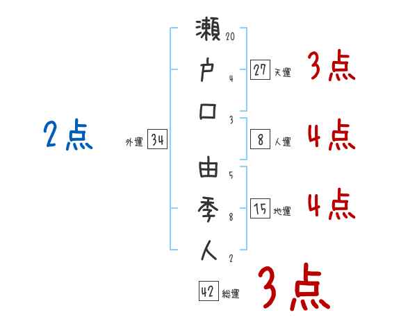 総運![]() | 瀬戸口由季人さんの総運は42画の3つ星!病気に注意。多芸であるが消極的でおとなしい。 あなたの人生を表す1番重要な運勢です。生涯を通じて影響する総合運となり、主に50歳以降の晩年期に影響を及ぼします。 |