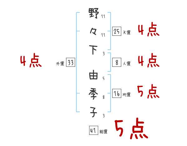 外運![]() | 野々下由季子さんの外運は33画の4つ星!権力志向でプライドが高い。勇気があり運を切り開き成功する。 生活面を象徴する運勢です。外部から受ける影響力を表し、結婚運、家庭運や職場、環境への順応性を表します。 |
