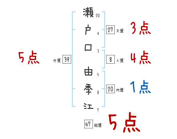 総運![]() | 瀬戸口由季江さんの総運は47画の5つ星!実力が開花し発展する円満な人生。財に恵まれる。 あなたの人生を表す1番重要な運勢です。生涯を通じて影響する総合運となり、主に50歳以降の晩年期に影響を及ぼします。 |