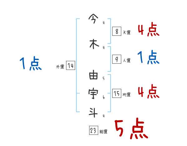 外運![]() | 今木由宇斗さんの外運は14画の1つ星!人に対して優しいがストレスを溜め込みがち。人間関係のトラブルを避けるよう気をつけましょう。 生活面を象徴する運勢です。外部から受ける影響力を表し、結婚運、家庭運や職場、環境への順応性を表します。 |