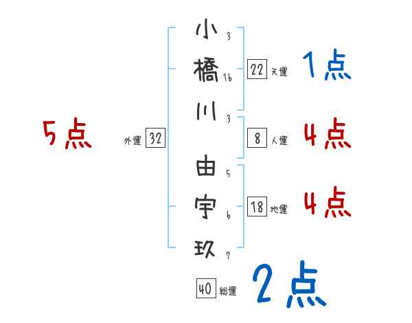 外運![]() | 小橋川由宇玖さんの外運は32画の5つ星!柔軟性があり成功する。チャンスが多く金運が良い。 生活面を象徴する運勢です。外部から受ける影響力を表し、結婚運、家庭運や職場、環境への順応性を表します。 |
