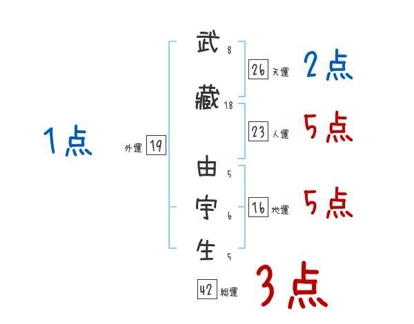 人運![]() | 武藏由宇生さんの人運は23画の5つ星!想像力に優れ活力がある。一代で成功し名誉を手に入れる。 性格や才能などを表す2番目に重要な運勢です。人間関係や協調性、社会的な成功に影響します。主に20歳から50歳ぐらいまでの中年期の運勢を表します。 |