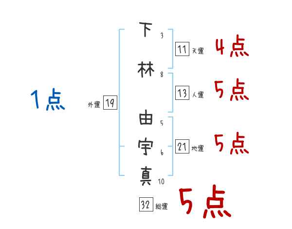 総運![]() | 下林由宇真さんの総運は32画の5つ星!柔軟性があり成功する。チャンスが多く金運が良い。 あなたの人生を表す1番重要な運勢です。生涯を通じて影響する総合運となり、主に50歳以降の晩年期に影響を及ぼします。 |