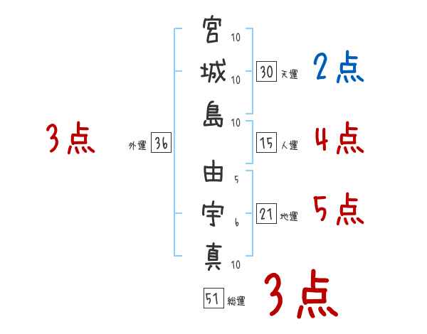 総運![]() | 宮城島由宇真さんの総運は51画の3つ星!変化が激しく、危険に注意。堅実な性格。 あなたの人生を表す1番重要な運勢です。生涯を通じて影響する総合運となり、主に50歳以降の晩年期に影響を及ぼします。 |