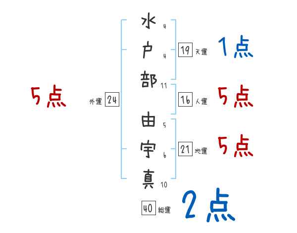 外運![]() | 水戸部由宇真さんの外運は24画の5つ星!家庭運が良く順調な人生。金運にも恵まれる。 生活面を象徴する運勢です。外部から受ける影響力を表し、結婚運、家庭運や職場、環境への順応性を表します。 |