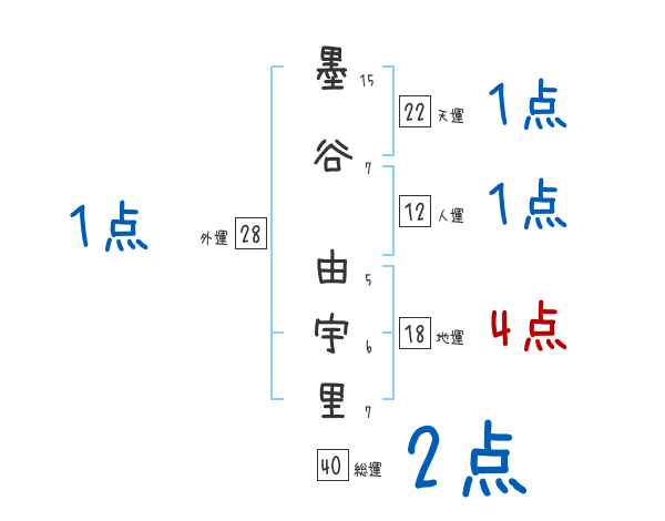 外運![]() | 墨谷由宇里さんの外運は28画の1つ星!家庭環境に注意。スポーツで活躍できる能力があるかも。 生活面を象徴する運勢です。外部から受ける影響力を表し、結婚運、家庭運や職場、環境への順応性を表します。 |
