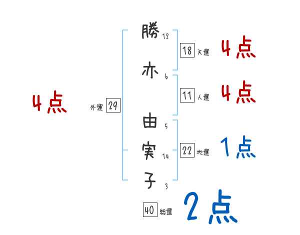 外運![]() | 勝亦由実子さんの外運は29画の4つ星!完全主義で才能がある。厳格な心の持ち主。 生活面を象徴する運勢です。外部から受ける影響力を表し、結婚運、家庭運や職場、環境への順応性を表します。 |