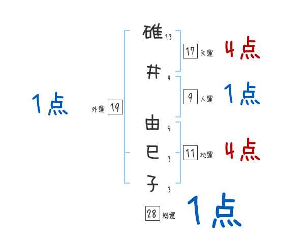 外運![]() | 碓井由巳子さんの外運は19画の1つ星!優れた才能を持ちますが、協調性が足りないことも。周りの人と協力する事を意識しましょう。 生活面を象徴する運勢です。外部から受ける影響力を表し、結婚運、家庭運や職場、環境への順応性を表します。 |