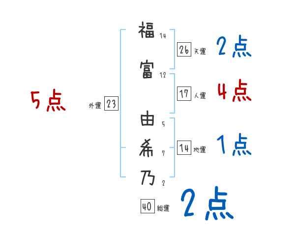 外運![]() | 福富由希乃さんの外運は23画の5つ星!想像力に優れ活力がある。一代で成功し名誉を手に入れる。 生活面を象徴する運勢です。外部から受ける影響力を表し、結婚運、家庭運や職場、環境への順応性を表します。 |