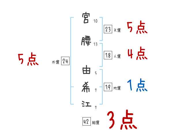 外運![]() | 宮腰由希江さんの外運は24画の5つ星!家庭運が良く順調な人生。金運にも恵まれる。 生活面を象徴する運勢です。外部から受ける影響力を表し、結婚運、家庭運や職場、環境への順応性を表します。 |
