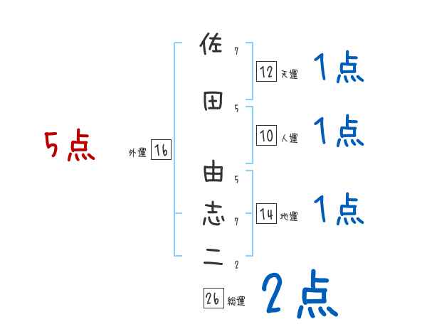 人運![]() | 佐田由志二さんの人運は10画の1つ星!不安を感じやすい傾向。ストレスを抱えないように注意しましょう。 性格や才能などを表す2番目に重要な運勢です。人間関係や協調性、社会的な成功に影響します。主に20歳から50歳ぐらいまでの中年期の運勢を表します。 |
