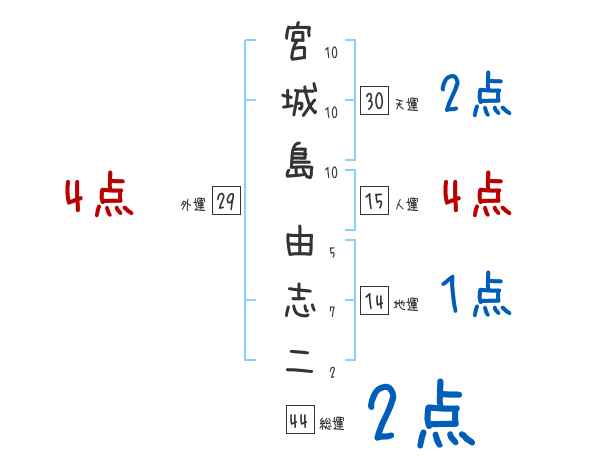 外運![]() | 宮城島由志二さんの外運は29画の4つ星!完全主義で才能がある。厳格な心の持ち主。 生活面を象徴する運勢です。外部から受ける影響力を表し、結婚運、家庭運や職場、環境への順応性を表します。 |