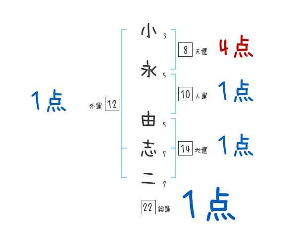 天運![]() | 小永由志二さんの天運は8画の4つ星!勤勉家。根気強く努力し成功する。忍耐力がある。 家系が持つ宿命的な運勢を表します。祖先から受け継いだ苗字ですので自分の力が及びません。家柄を象徴します。 |