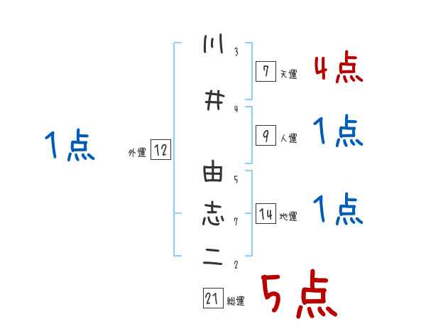 天運![]() | 川井由志二さんの天運は7画の4つ星!強い意志や信念を持ち独立心が強い。自立する。 家系が持つ宿命的な運勢を表します。祖先から受け継いだ苗字ですので自分の力が及びません。家柄を象徴します。 |