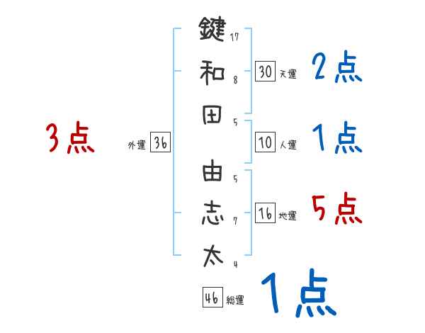 天運![]() | 鍵和田由志太さんの天運は30画の2つ星!浮き沈みの激しさに注意しましょう。 家系が持つ宿命的な運勢を表します。祖先から受け継いだ苗字ですので自分の力が及びません。家柄を象徴します。 |