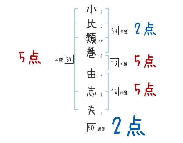 外運![]() | 小比類巻由志夫さんの外運は37画の5つ星!努力家で順応性に優れる。現実的な考え方ができ忠実に物事をこなす。 生活面を象徴する運勢です。外部から受ける影響力を表し、結婚運、家庭運や職場、環境への順応性を表します。 |