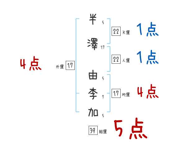 外運![]() | 半澤由李加さんの外運は17画の4つ星!積極的な行動力。地位を気づき財産を手に入れる。純粋な心と直感力。 生活面を象徴する運勢です。外部から受ける影響力を表し、結婚運、家庭運や職場、環境への順応性を表します。 |
