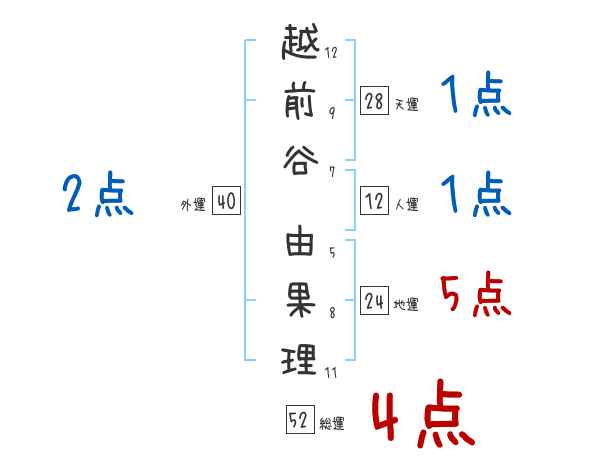 天運![]() | 越前谷由果理さんの天運は28画の1つ星!家庭環境に注意。スポーツで活躍できる能力があるかも。 家系が持つ宿命的な運勢を表します。祖先から受け継いだ苗字ですので自分の力が及びません。家柄を象徴します。 |