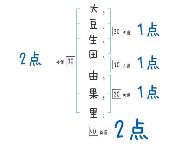 人運![]() | 大豆生田由果里さんの人運は10画の1つ星!不安を感じやすい傾向。ストレスを抱えないように注意しましょう。 性格や才能などを表す2番目に重要な運勢です。人間関係や協調性、社会的な成功に影響します。主に20歳から50歳ぐらいまでの中年期の運勢を表します。 |