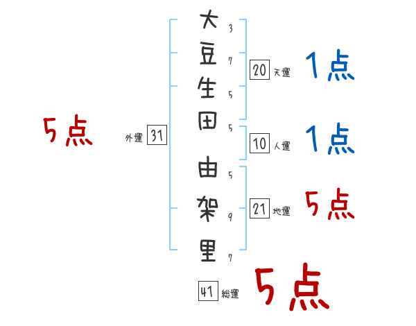 総運![]() | 大豆生田由架里さんの総運は41画の5つ星!大志を抱き、目標に向かって実力を発揮し達成する。温和な性格。 あなたの人生を表す1番重要な運勢です。生涯を通じて影響する総合運となり、主に50歳以降の晩年期に影響を及ぼします。 |