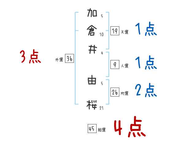 外運![]() | 加倉井由桜さんの外運は36画の3つ星!先見性が豊かです。多少神経質で苦労することも。 生活面を象徴する運勢です。外部から受ける影響力を表し、結婚運、家庭運や職場、環境への順応性を表します。 |