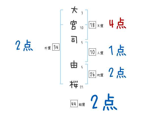 外運![]() | 大宮司由桜さんの外運は34画の2つ星!独創性に優れるが、自尊心が強く災難に注意しましょう。 生活面を象徴する運勢です。外部から受ける影響力を表し、結婚運、家庭運や職場、環境への順応性を表します。 |