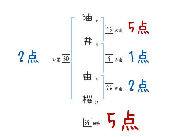 総運![]() | 油井由桜さんの総運は39画の5つ星!社交性に優れ人望が厚い。人の上に立ち成功する。 あなたの人生を表す1番重要な運勢です。生涯を通じて影響する総合運となり、主に50歳以降の晩年期に影響を及ぼします。 |