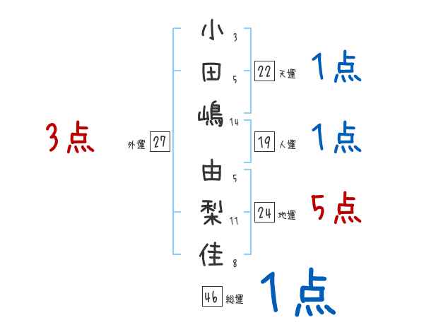 総運![]() | 小田嶋由梨佳さんの総運は46画の1つ星!迷走することが多く苦労するかも。目先のことにとらわれないように。 あなたの人生を表す1番重要な運勢です。生涯を通じて影響する総合運となり、主に50歳以降の晩年期に影響を及ぼします。 |