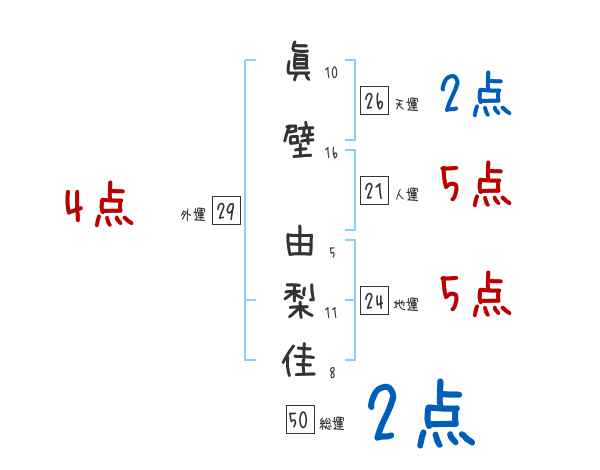 天運![]() | 眞壁由梨佳さんの天運は26画の2つ星!波瀾万丈かも。信頼できる人を大事にしましょう。 家系が持つ宿命的な運勢を表します。祖先から受け継いだ苗字ですので自分の力が及びません。家柄を象徴します。 |