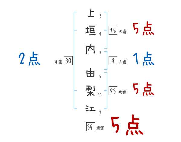 総運![]() | 上垣内由梨江さんの総運は39画の5つ星!社交性に優れ人望が厚い。人の上に立ち成功する。 あなたの人生を表す1番重要な運勢です。生涯を通じて影響する総合運となり、主に50歳以降の晩年期に影響を及ぼします。 |