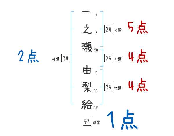 外運![]() | 一之瀬由梨絵さんの外運は34画の2つ星!独創性に優れるが、自尊心が強く災難に注意しましょう。 生活面を象徴する運勢です。外部から受ける影響力を表し、結婚運、家庭運や職場、環境への順応性を表します。 |