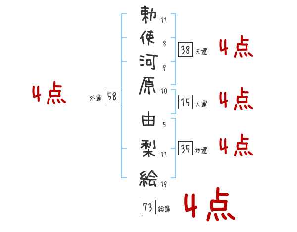 外運![]() | 勅使河原由梨絵さんの外運は58画の4つ星!安定した生活。大器晩成タイプ。 生活面を象徴する運勢です。外部から受ける影響力を表し、結婚運、家庭運や職場、環境への順応性を表します。 |