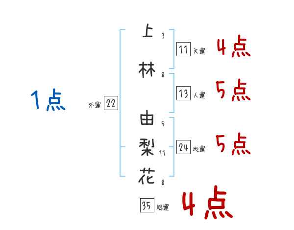 天運![]() | 上林由梨花さんの天運は11画の4つ星!着実に富や地位を得る幸運な人生。 家系が持つ宿命的な運勢を表します。祖先から受け継いだ苗字ですので自分の力が及びません。家柄を象徴します。 |
