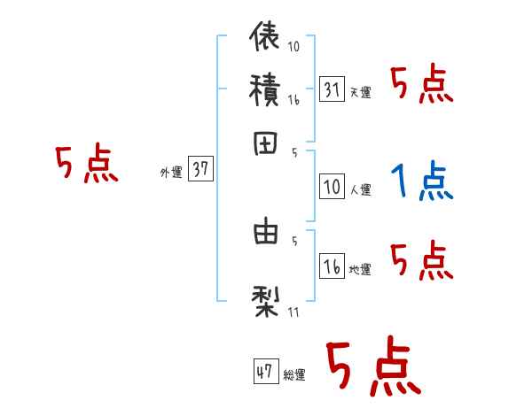 総運![]() | 俵積田由梨さんの総運は47画の5つ星!実力が開花し発展する円満な人生。財に恵まれる。 あなたの人生を表す1番重要な運勢です。生涯を通じて影響する総合運となり、主に50歳以降の晩年期に影響を及ぼします。 |