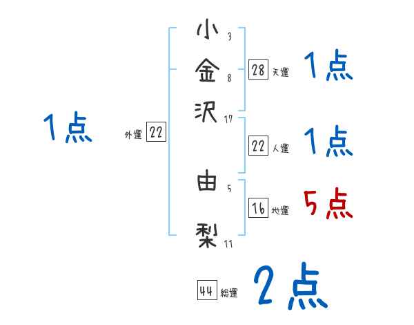 外運![]() | 小金沢由梨さんの外運は22画の1つ星!努力することが苦手ないっぽう手先が器用。芸術性にも優れる。 生活面を象徴する運勢です。外部から受ける影響力を表し、結婚運、家庭運や職場、環境への順応性を表します。 |